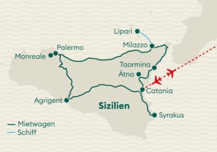 Sizilien – ein Paradies für alle, die auf der Suche nach einer Insel sind, die ihre authentische Atmosphäre bewahrt hat und sowohl über ein reiches kulturelles Erbe als auch über eine beeindruckende Natur verfügt. Die Insel blickt auf eine bewegte Geschichte mit verschiedensten Kulturen und Epochen zurück. Noch heute sind davon in den Ausgrabungsstätten zahlreiche Überreste zu sehen. Darüber hinaus gibt es etliche landschaftliche Highlights zu entdecken wie etwa die Vulkane Ätna und Stromboli, das Naturreservat Monte Fossa delle Felci und schwarze Strände. Kurz und bündig: Sizilien bietet alles für eine perfekte Rundreise im Mietwagen!