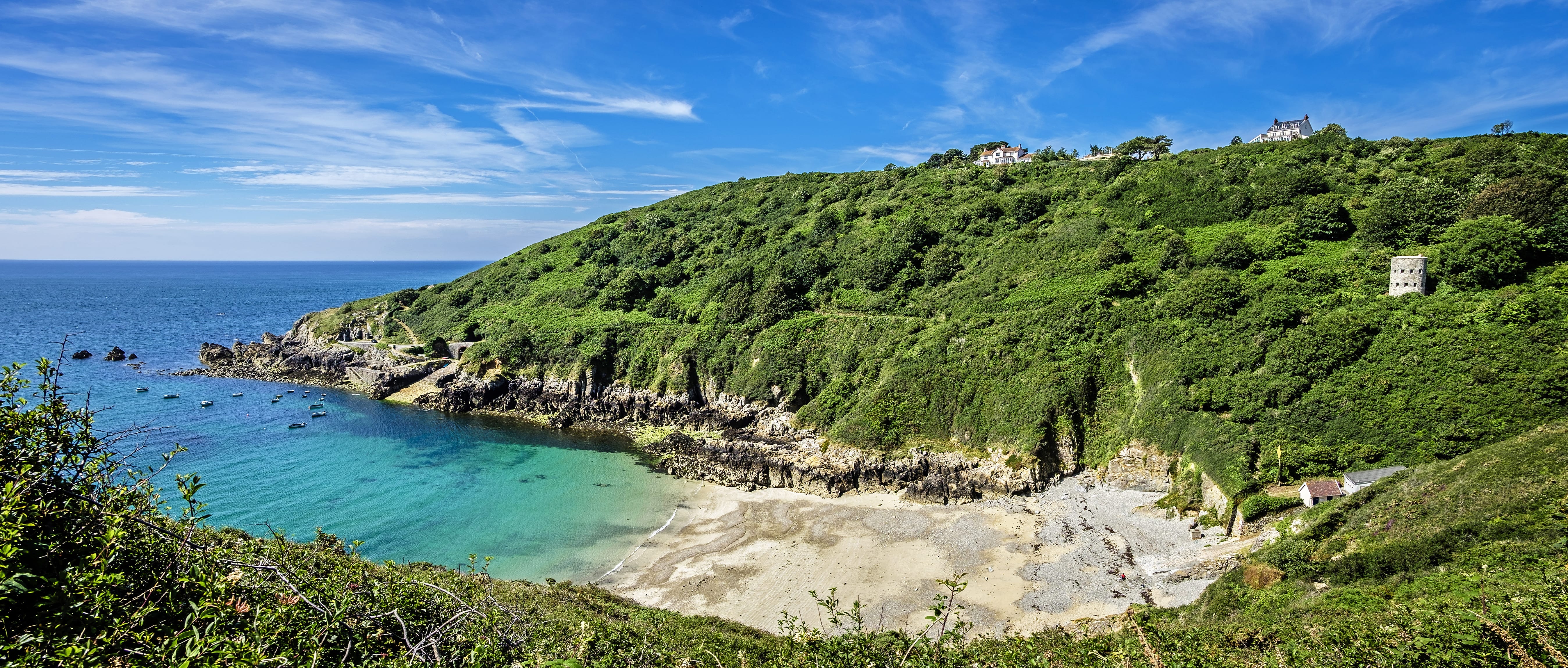 Das Wetter bleibt wechselhaft. Mal windet es, mal nieselt es kurz, und dann lässt die Sonne wieder alles dampfen. Der Weg entlang der steilen Ostküste schlängelt sich durch dichte kalttropische Vegetation auf und ab, und dazwischen bieten sich Ausblicke auf kleine, einsame Buchten, die Küste der Normandie weit im Osten und die Schwesterinseln Sark, Herm und Jersey. An der Süd- und Westseite der Insel flacht das Gelände stark ab, und die sandigen Buchten öffnen sich weit und ausladend den kraftvollen Gezeiten.